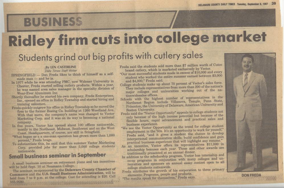 The story of Vector actually began in 1971 when I started to sell Cutco while still in college. Teresa and I had just gotten married and I answered a blind ad in the Delaware County Daily Times. I went down to an office near the 69th Street shopping area in Upper Darby. I was 19 at the time and had a job pumping gas at the local ARCO station on Chester Pike in my home town of Sharon Hill, PA. There were about 12 guys in the room for a group interview. It was my first exposure to Cutco cutlery conducted by Mr. Justin Greenston. Guess what? I got the job!!! "Greenie" was my first manager. He had about 25 years with the company and was a wealth of knowledge. The Assistant Manager was a guy named John Demas who also lived in Delco, not far from me. John took me into the field and taught me how to sell. John was a real old time "tin men" type sales guy and I learned a lot from him but also began to see things that I didn't like about the business.
